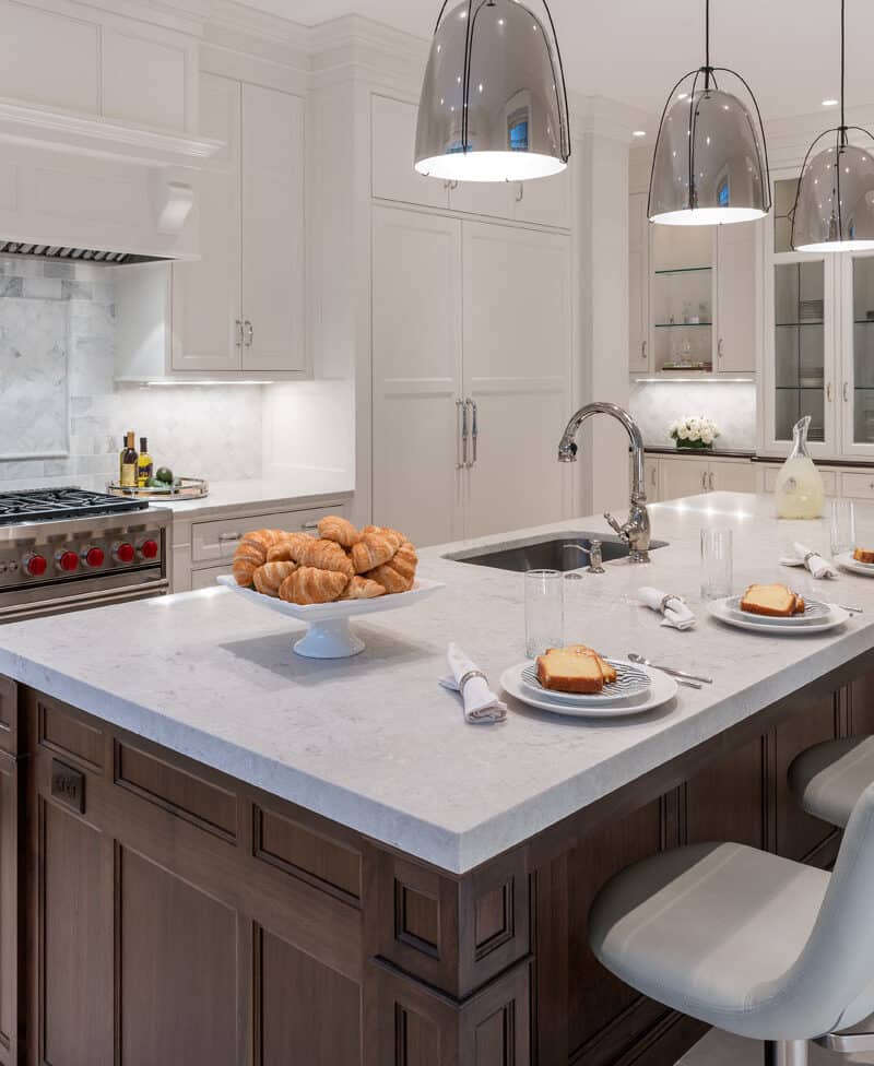 Modern kitchen in a stately home with a large island, three gray chairs, pendant lights, a gas stove, and plates with croissants and drinks on the counter.