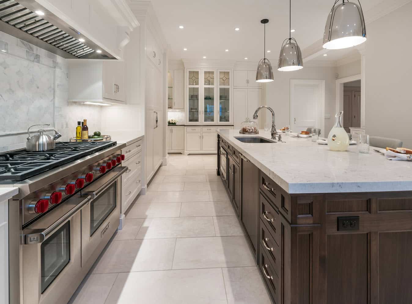 When Victoria Heydari of Mitchell Construction Group in Medfield, Massachusetts began plans for the kitchen renovation of this 1920s-era Classic Brick Georgian Colonial home, the existing kitchen was tired and dated and not befitting the grace and splendor of this stately home. White custom cabinetry gave the new kitchen a clean and tasteful look, beautifully complimented by a ten-foot walnut island. Clear leaded glass in select cabinetry added to the lightness and elegance of the space. White Caesar-Stone countertops with traces of gray perfectly tied the cabinetry to the marble mosaic back-splash, and porcelain floor tile. The inclusion of a 48″ Wolf Range with red knobs and Warming Drawer and a Sub-Zero Refrigerator and Freezer completed the transformation of this kitchen into an entertainer’s dream.