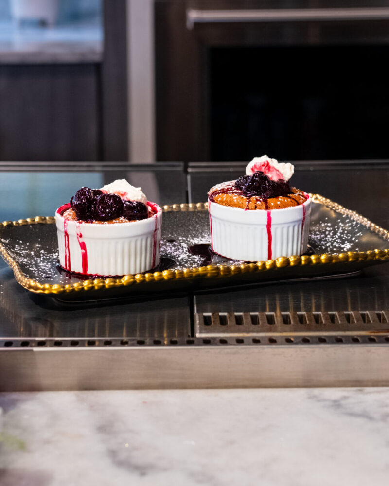 Preheat Wolf Convection Oven to 400°F on Bake. Place ramekins on a tray in the Wolf Wall Oven. Immediately lower the temperature to 375°F and bake for 15–17 minutes, until risen but slightly wobbly in the center. - Make Cherry-Port Reduction